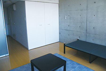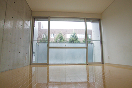 山形大学北門の目の前。コンクリート打ち放しの最新物件。一歩踏み入れると緑に囲まれたまるで別世界。
